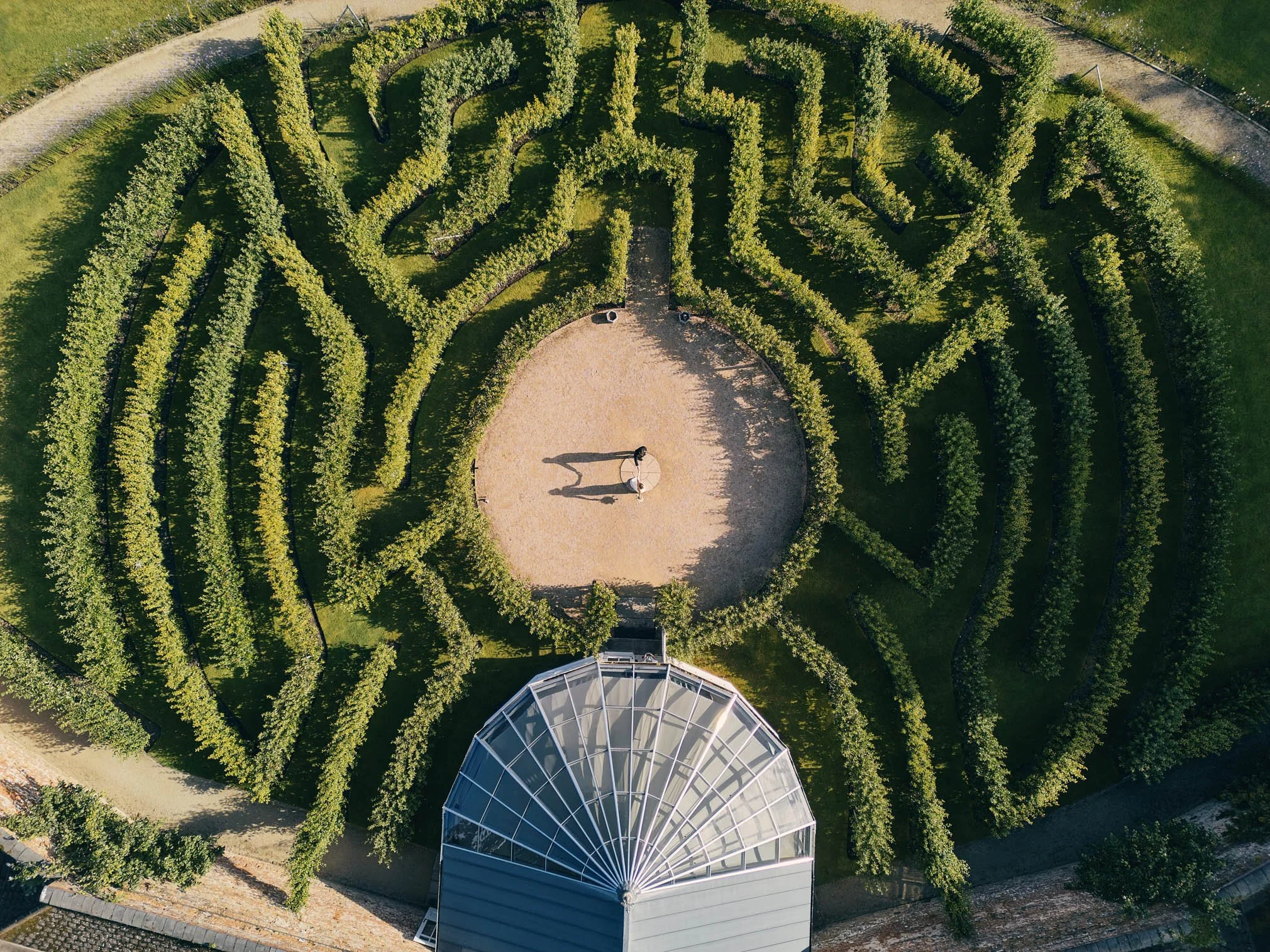 Imagine a bird’s-eye view of your ceremony in the Glasshouse, with the symmetrical fruit tree maze encircling the venue – a pattern only fully appreciated from the sky. I can also capture a wide shot of your entire wedding party gathered in the gardens, the vast green parkland stretching beyond. The estate’s mere and woodlands, the sweeping driveway up to the Abbey, the neatly landscaped hedges and lawns – all of these look spectacular in drone shots. These images give a sense of scale and grandeur, showcasing the full beauty of the estate that surrounds you on your big day.
